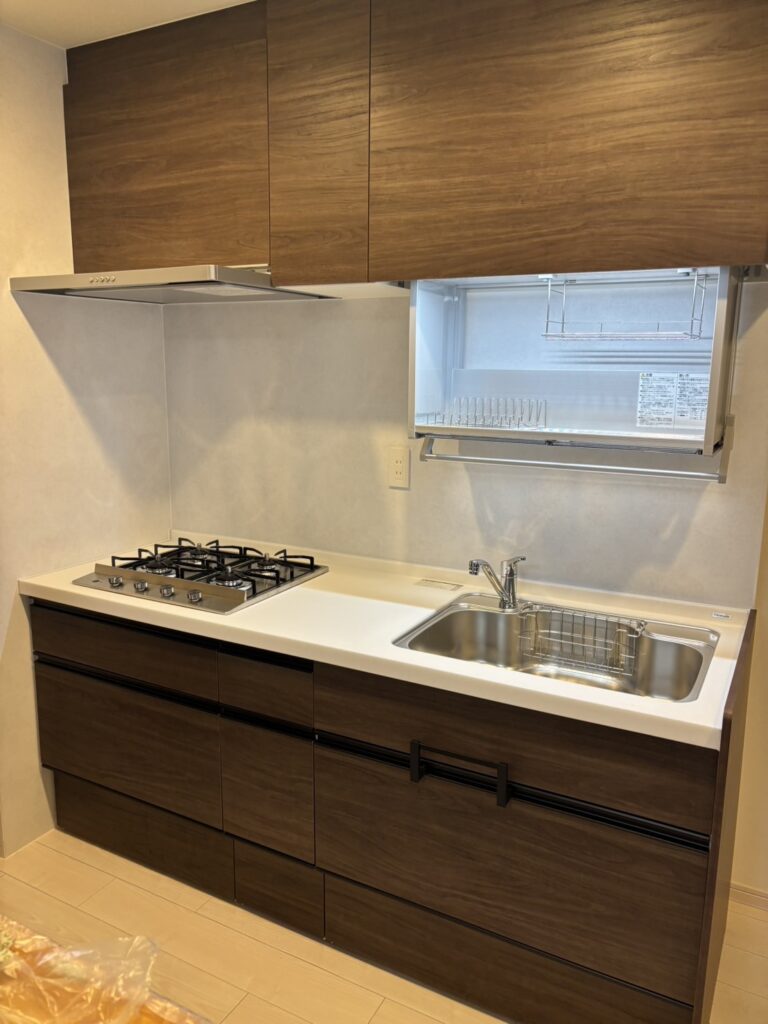 以前のパネル調キッチンから生まれ変わったのは、木目が美しいダークウォルナットの空間に。アクリストーンワークトップの白が光をやわらかく反射し、重厚感の中にも軽やかさを感じます。