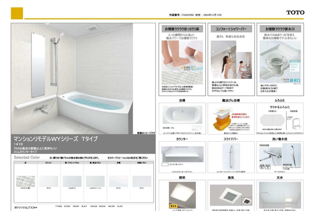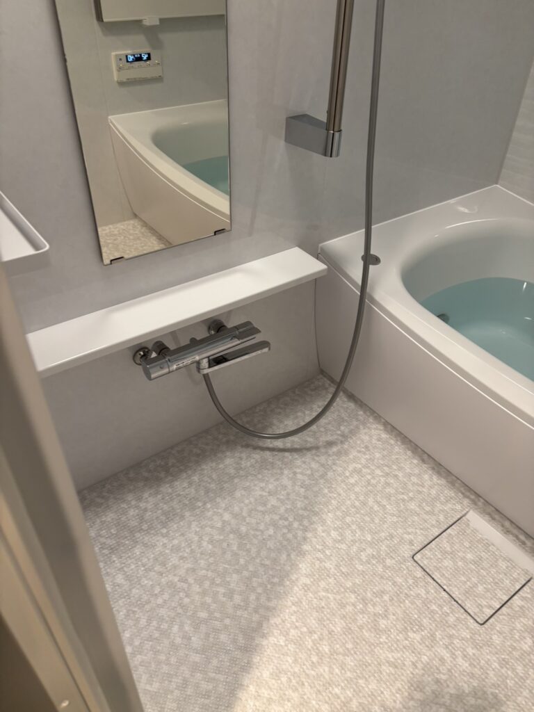 全体を白で統一したことで空間全体がぐっと明るく感じられる浴室に。TOTOのマンションリモデルWYシリーズならではのなめらかなパネルと光の反射が上質で清潔な印象を演出します。