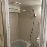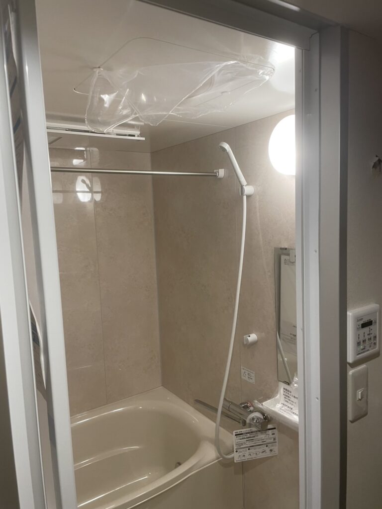 ベージュで統一された浴室は落ち着きとやわらかさが共存する穏やかな印象に。光を柔らかく反射する壁パネルと明るいベージュの床が調和し心地よい温もりを感じる空間を演出します。