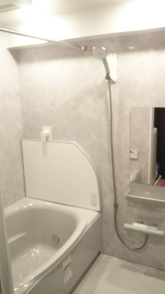 ストーンシェルグレーを基調に空間全体をグレートーンで統一。以前のタイル調から一新し、継ぎ目の少ないシームレスなデザインへ。上質で静謐な印象の浴室に仕上がりました。