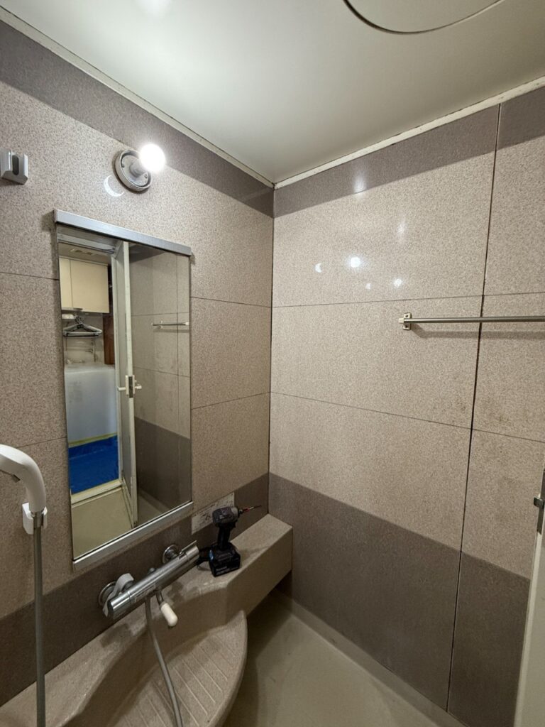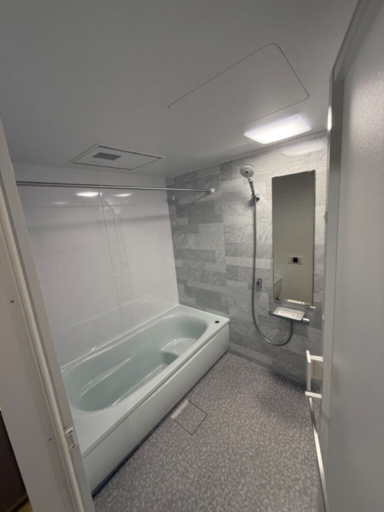 パティオホワイトが放つ上品な光沢が浴室全体を明るく包み込みます。LIXILベーシアシャワートイレとの統一感も見事で、清潔感と高級感を両立しています。