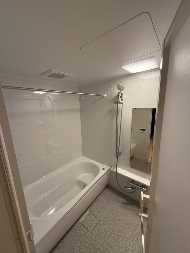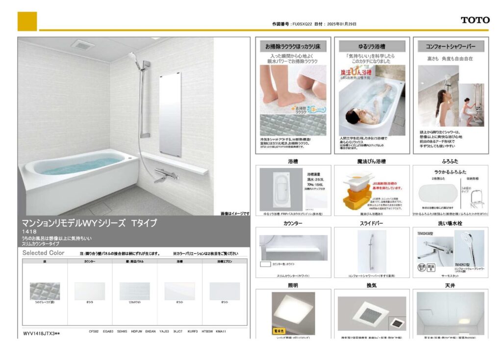 TOTO WYシリーズのリフルホワイトを採用し明るさと清潔感を重視した浴室へ。壁から浴槽まで白で統一することで空間の奥行きが感じられます。