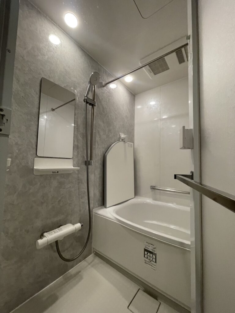 ストーンシェルグレーと白の組み合わせで高級感ある浴室へリフォームしました。石目調の壁がアクセントになり落ち着きと品を感じさせます。