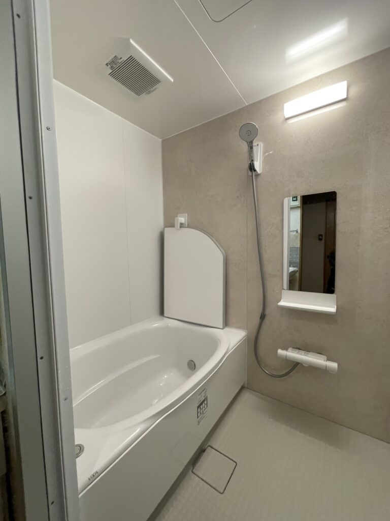 壁パネルにマーフィルベージュをアクセントに、マットホワイトを基調としたパネルで浴室全体を明るく清潔感のあるトーンに統一しました。