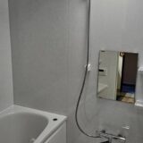 壁パネルにマーフィルベージュをアクセントに、マットホワイトを基調としたパネルで浴室全体を明るく清潔感のあるトーンに統一しました。