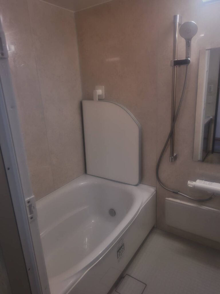 マフィールベージュの壁に白い浴槽を組み合わせ全体にやわらかなトーンを演出。温もりを感じるカラーで、以前の硬い印象から一転、優しく包み込むような空間に仕上がりました。