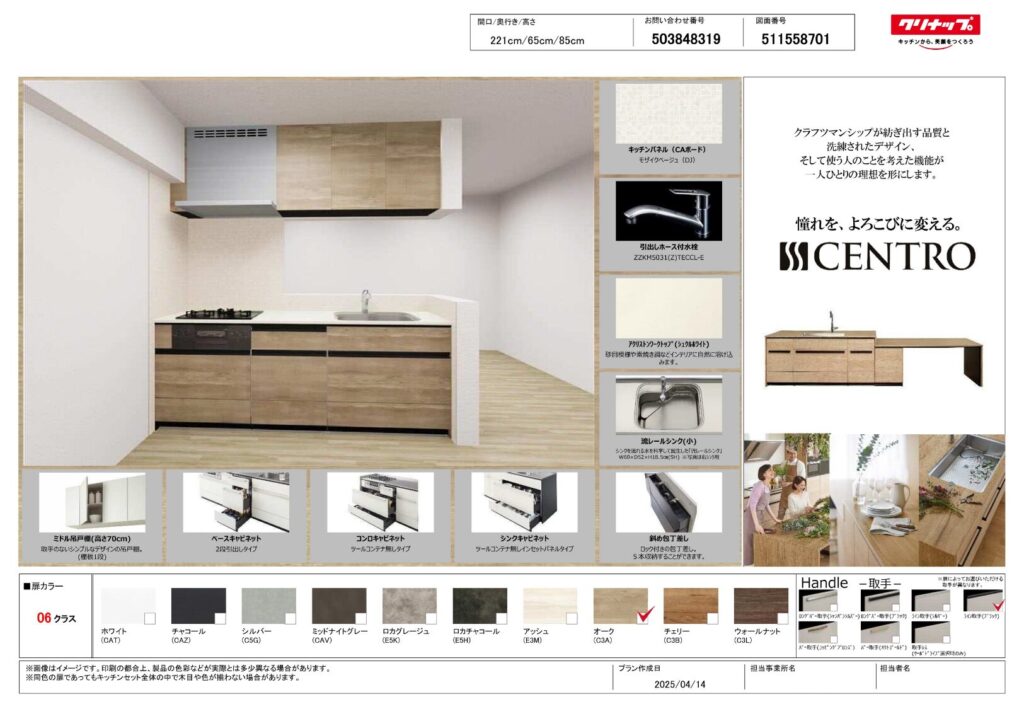 クリナップの最上位モデルCENTROを採用。天然木のような深みあるオークカラーが空間に温もりを与えます。