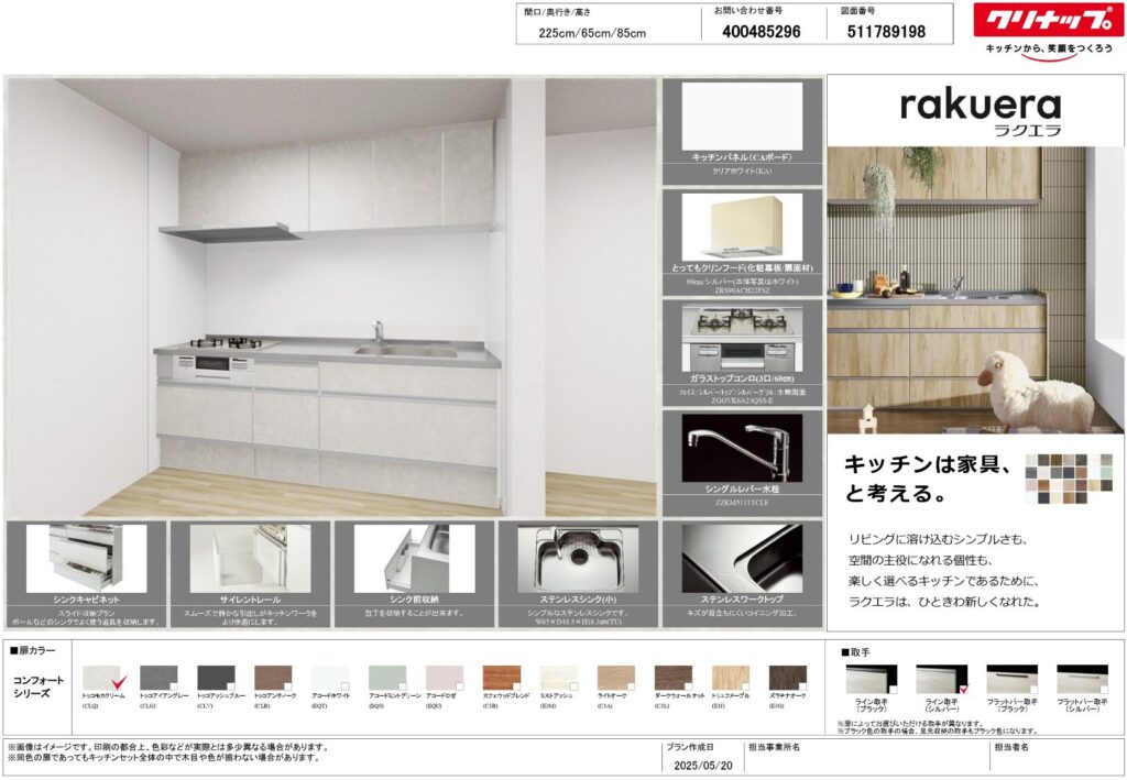 トッコモカクリームのやさしい木目を生かし、ステンレスワークトップでコントラストをつけることで温もりとスタイリッシュさを両立。光の当たり方でワークトップがやわらかく反射し、空間にメリハリが生まれます。