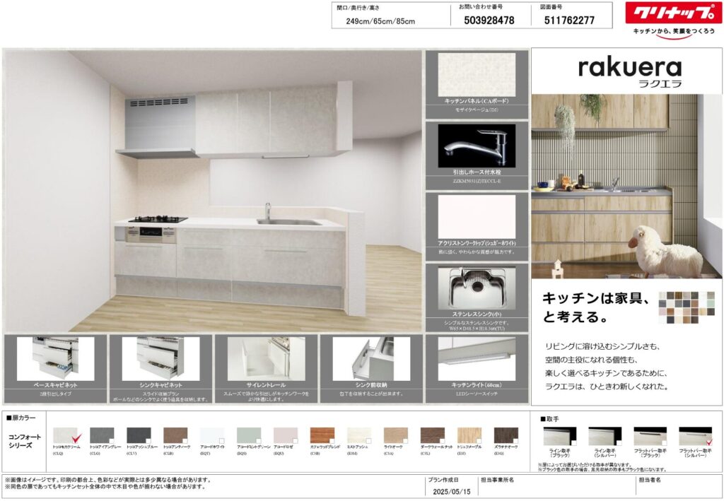 トッコモカクリームの柔らかな扉色と、シュガーホワイトのアクリストーンワークトップが手元を自然に明るくしてくれます。