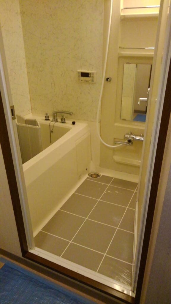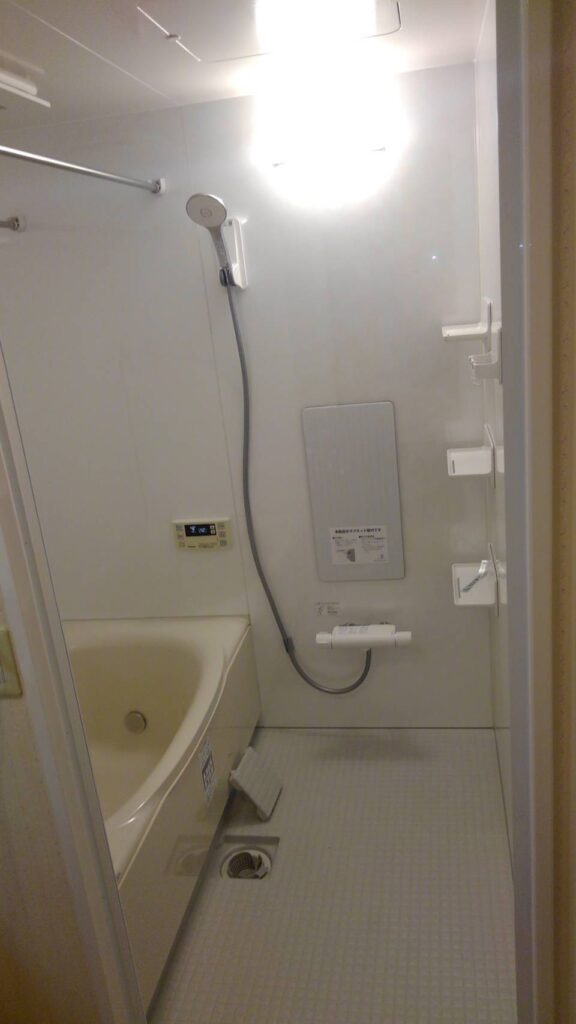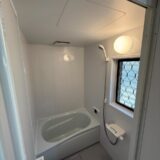 クルムホワイトのパネルとベージュの浴槽が自然に馴染み、柔らかく上品な印象の浴室に仕上がりました。色味が優しいため圧迫感がなく照明の光も綺麗に反射します。