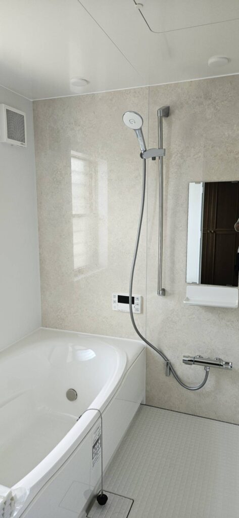 浴室全体が明るく優しい印象になります。洗面化粧台とトイレも白で統一したことで、住まい全体に清潔感が生まれどの空間もすっきりとまとまりのある仕上がりに。