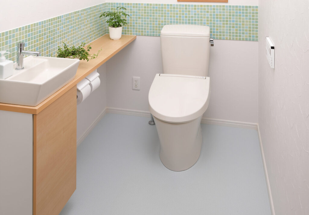 フロアタイルは、塩化ビニルを素材とした床材で、耐久性とデザイン性の高さが特徴です。石目調や木目調などデザインのバリエーションが豊富なため、トイレ空間を上質で落ち着いた印象に仕上げたい場合に向いています。