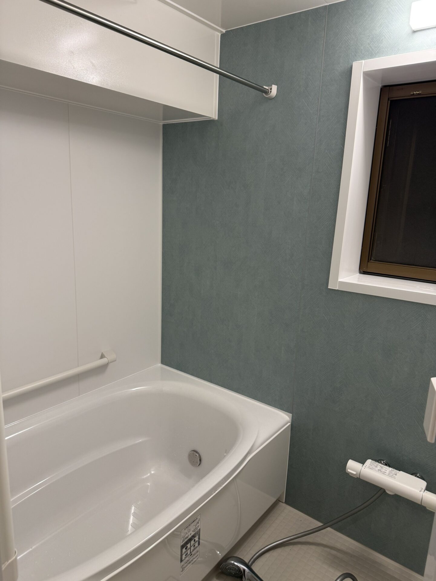 アクセントパネルのヘンボリーミントが、浴室に清々しい空気をもたらします。マットホワイトとの組み合わせが上品で明るく、ベージュの床が全体をやさしく包み込みました。