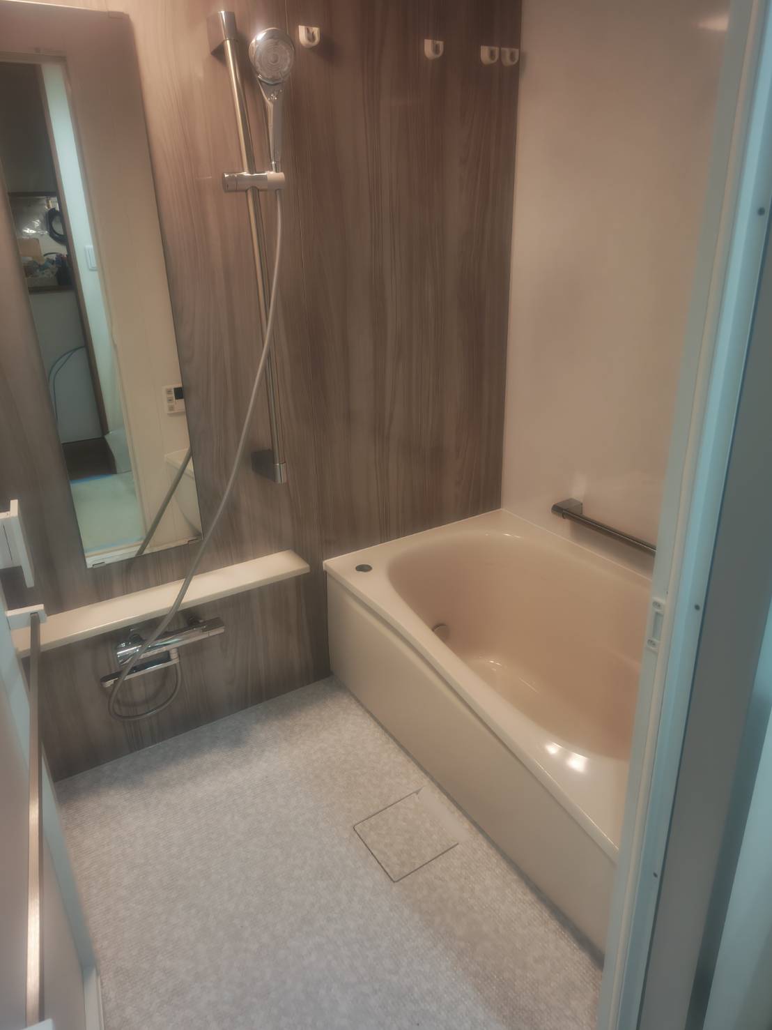 TOTOマンションリモデルWYシリーズの浴室は、アクセントパネルが映える明るい空間に仕上がりました。断熱性に優れた魔法びん浴槽でお湯が冷めにくく快適な入浴を長くお楽しみいただけます。トイレはLIXILベーシアシャワートイレを採用。清潔感のあるデザインに加え床のワンポイントカラーが空間を明るく見せます。