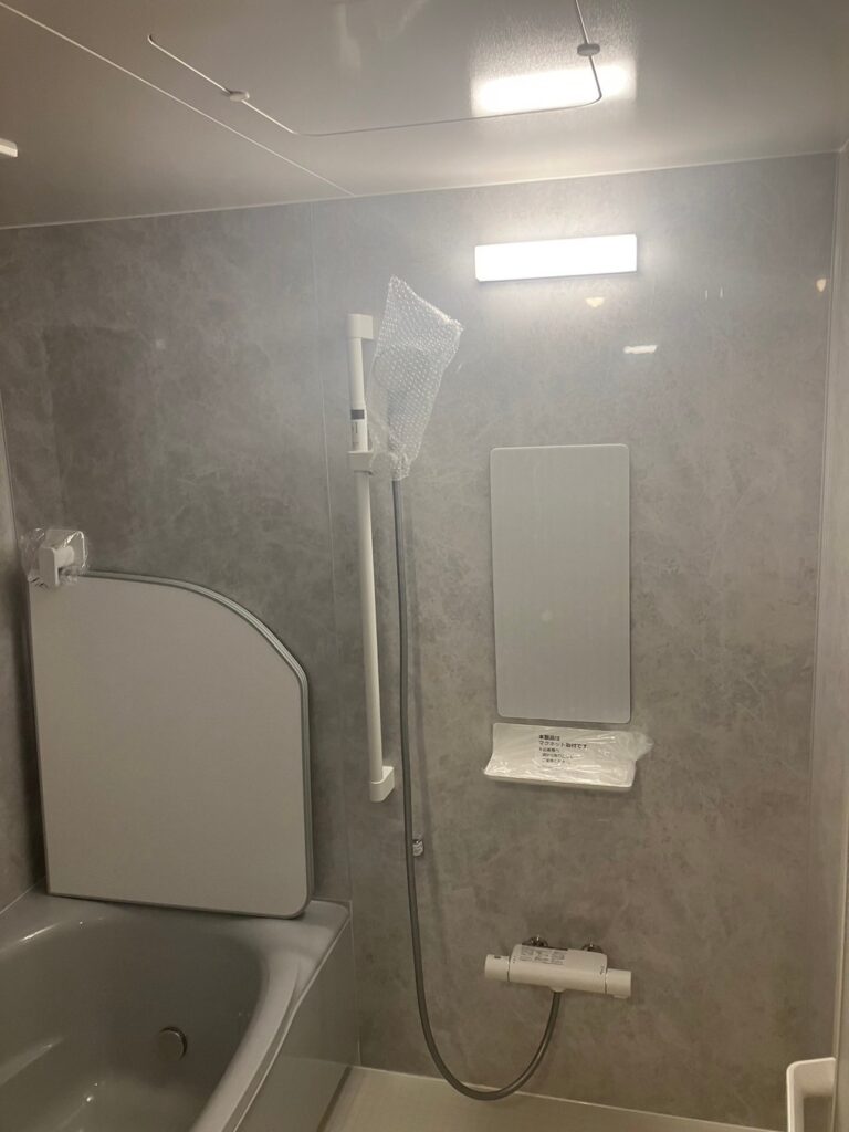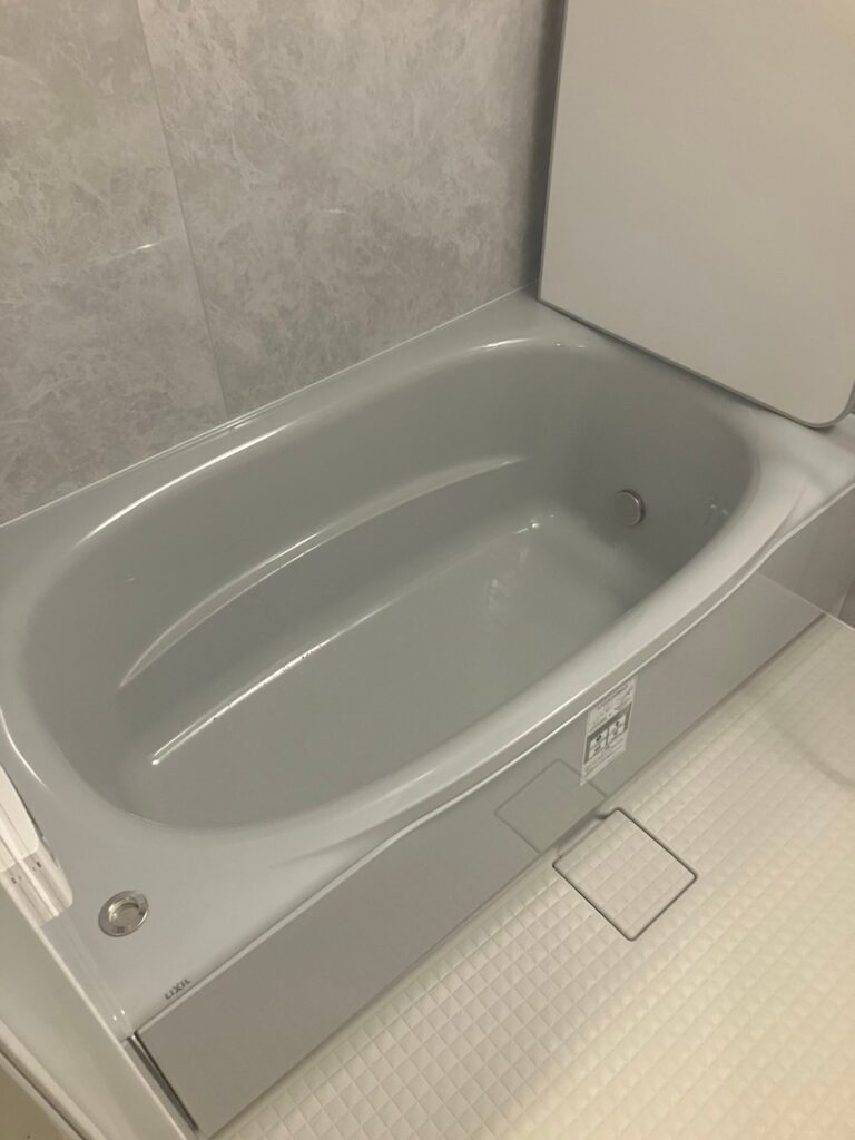 ストーンシェルグレーのマットな壁面と光を反射する浴槽の対比が、上質なバランスを生み出す仕上がりに。