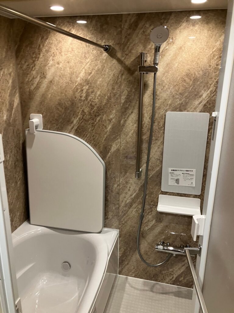 クオーチェトープの壁がつくる高級感とやわらかなホワイトの浴槽。LIXIL リノビオVシリーズの上質な素材感が調和し、穏やかで落ち着いたバスルームになりました。
