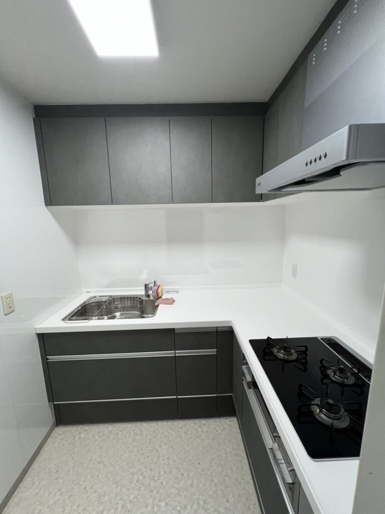 扉に採用したトッコアイアングレーは、木目ではなく無機質な表情が特長のカラーです。白いワークトップやキッチンパネルと組み合わせることで、重さを抑えつつ空間全体にシャープさを与えています。