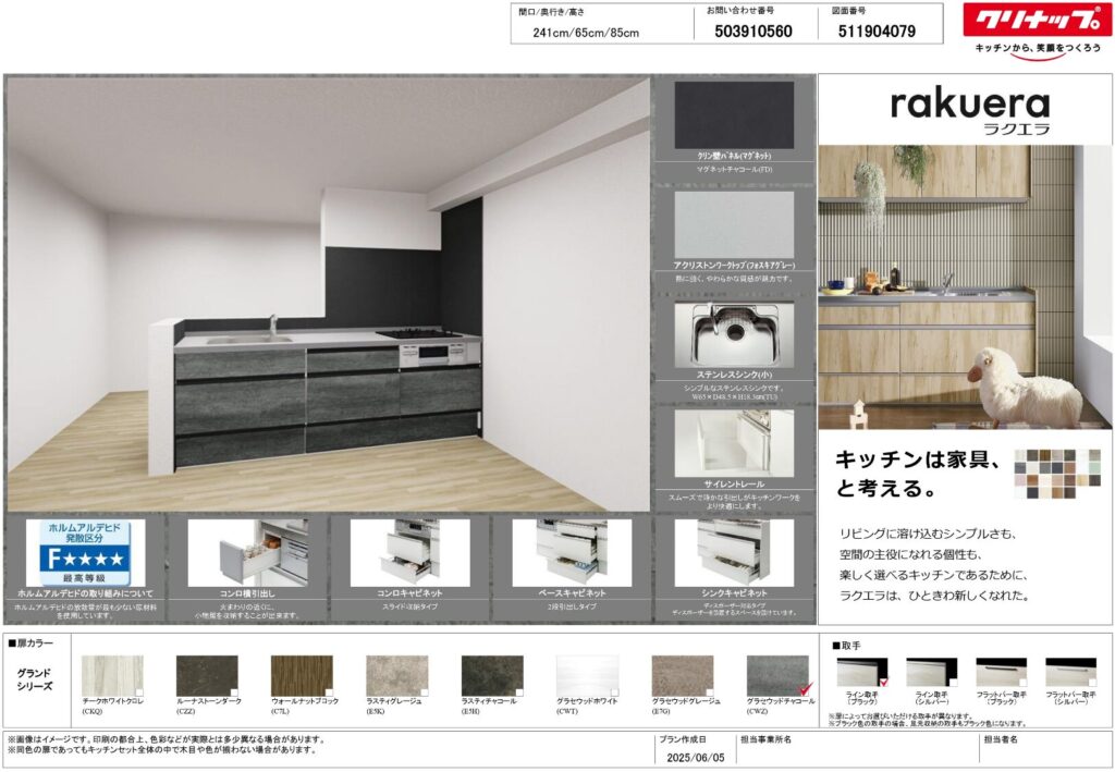 扉カラーはクラッシュドチャコール。深みのある色味が一直線に並ぶことでキッチン全体が引き締まって見えます。フラットな扉が連続し、色のムラが出にくいため重たさを感じにくい印象です。