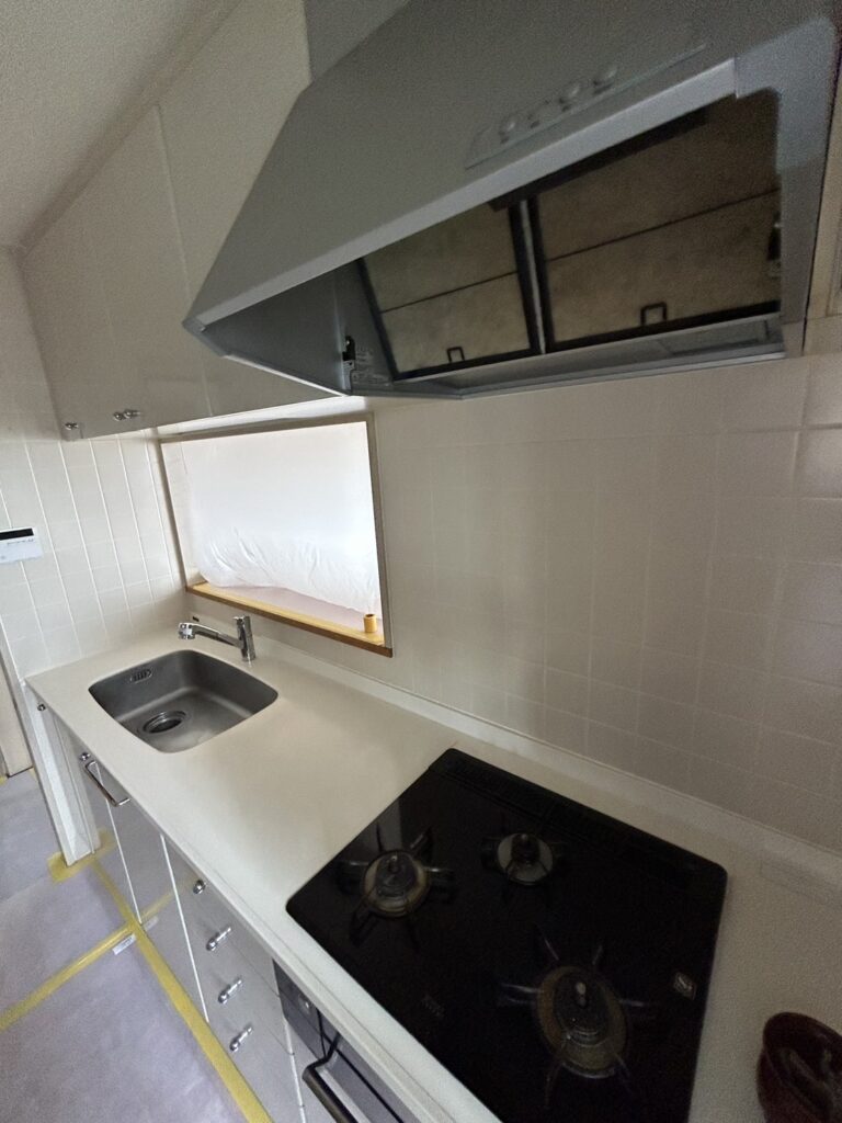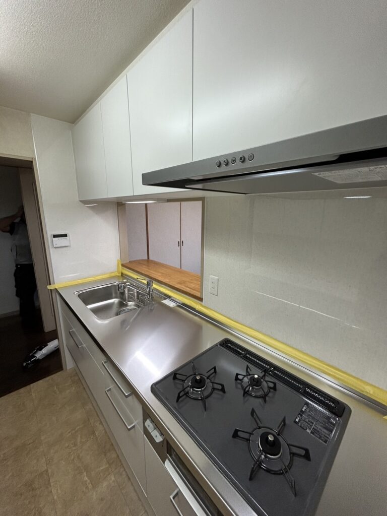 扉はトーンホワイトで揃え、ワークトップにはステンレスを採用しています。日々使う中で水はねや汚れが出やすい部分も、素材の特性から拭き取りやすく、手入れの負担を抑えやすい状態です。