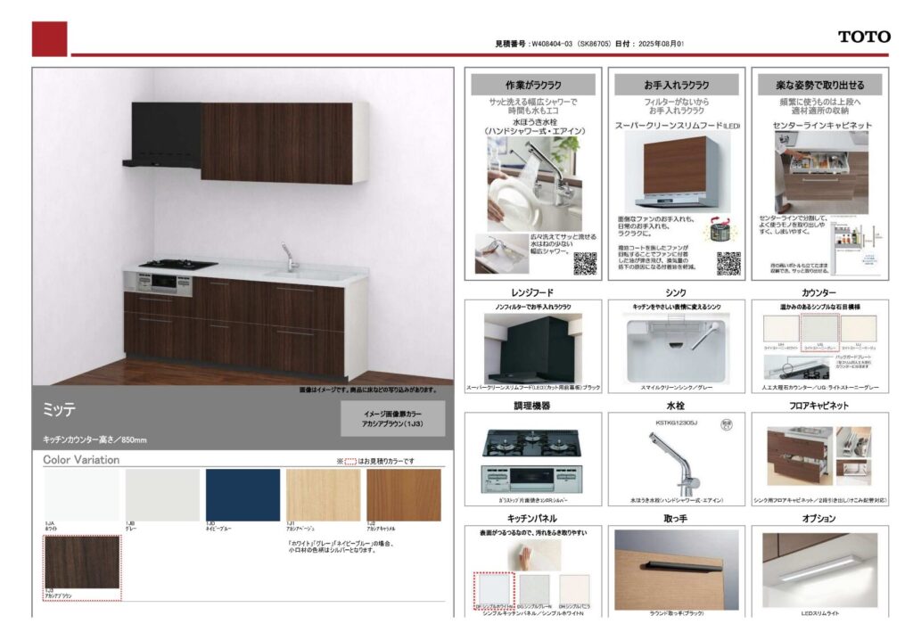 アカシアブラウンの木目が正面に広がるキッチンです。濃淡のある柄が表情をつくり、白いワークトップとの色の対比がはっきりしています。