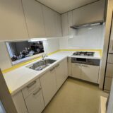 アカシアブラウンの木目が正面に広がるキッチンです。濃淡のある柄が表情をつくり、白いワークトップとの色の対比がはっきりしています。