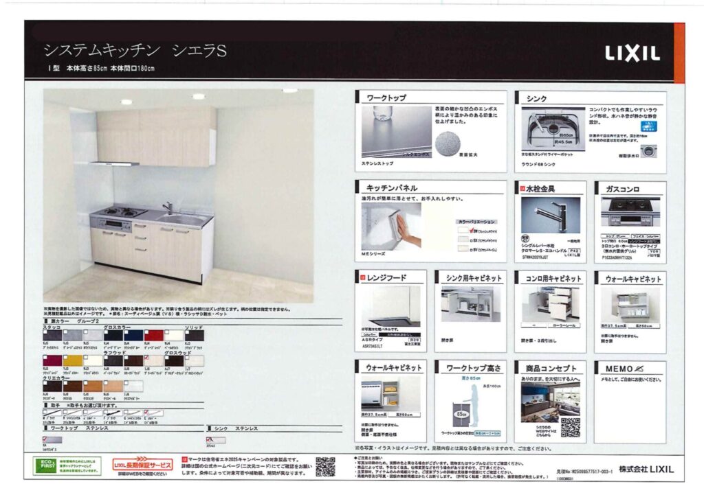 LIXILの「シエラS」を採用しました。ワークトップはステンレストップ仕様で、扉カラーにはブリーチドウッドを採用しています。水栓はシングルレバー水栓クロマーレSを選びレバー操作で吐水と止水、温度調整を簡単に行える水栓です。