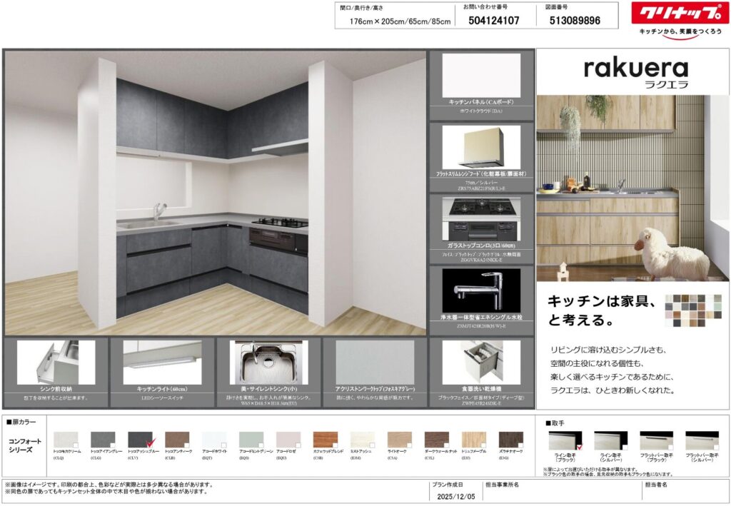 扉カラーには、トッコアッシュブルーを採用しています。ブルーグレーの扉デザインで、空間のアクセントになります。キッチンパネルはCAボード(ホワイトクラウド)を採用しており、表面が拭き取りやすい仕様です。