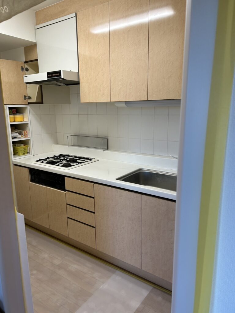 見るたびに心地よさを感じる、素材の美しさと日々の使いやすさが共存するキッチンリフォームです。光沢のあるグロスライトウッドの木目が空間をやわらかく明るく包み込み、人造大理石トップとの組み合わせが全体に軽やかなバランスをもたらします。